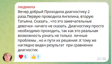 Вечер добрый Проходила диагностику 2 раза. Первую проводила Ангелина, вторую Татьяна. Сказать , что это замечательные девочки- ничего не сказать .Диагностику просто необходимо проходить, так как это реальная возможность узнать не только личные проблемы , но и пути их решения .К тому же наглядно виден результат при сравнении диагностик