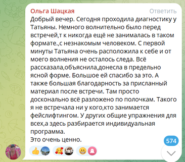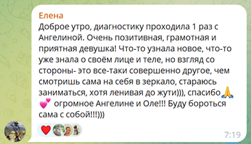Доброе утро, диагностику проходила 1 раз с Ангелиной. Очень позитивная, грамотная и приятная девушка! Что-то узнала новое, что-то уже знала о своём лице и теле, но взгляд со стороны- это все-таки совершенно другое, чем смотришь сама на себя в зеркало, стараюсь заниматься, хотя ленивая до жути))), спасибо🙏💕 огромное Ангелине и Оле!!! Буду бороться сама с собой!!!)))